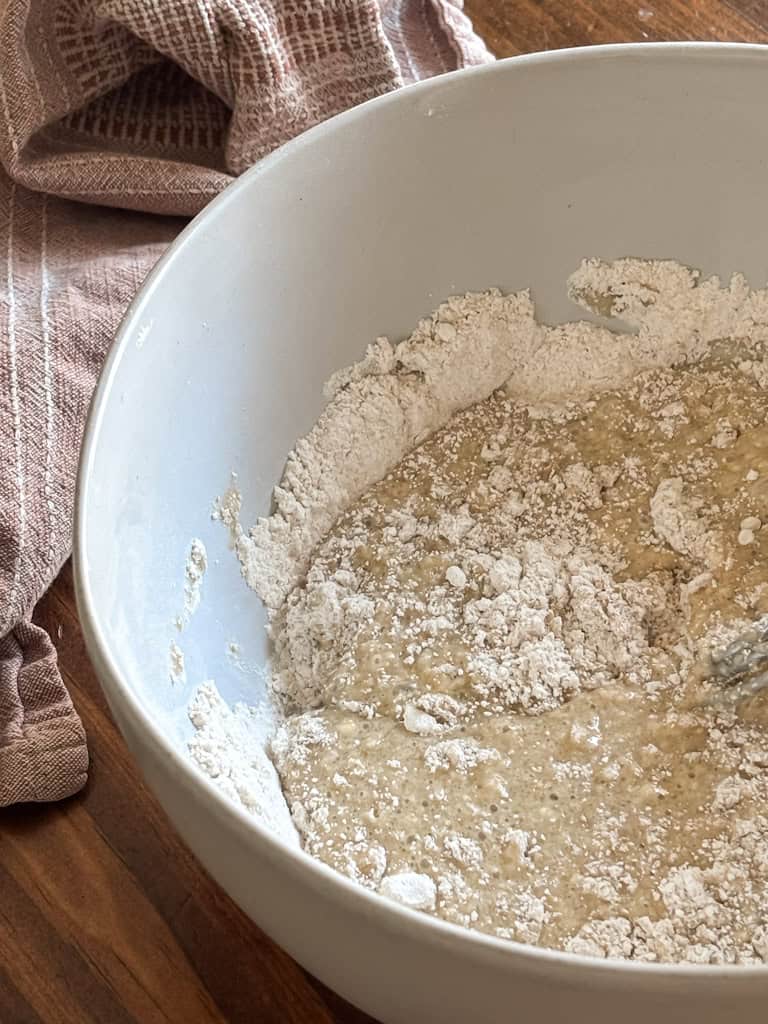 Make a well in the center and add your wet ingredients — milk, oil, and honey. Make sure your milk is room temperature so everything combines smoothly.