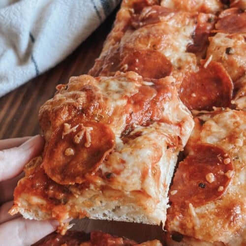 Cheese Lover’s Detroit Style—If you want to highlight that classic Detroit style pizza flavor, use cubes of mozzarella cheese (or Wisconsin brick cheese if you find it at the grocery store). Press the cheese all the way to the sides of the pan so it melts down along the edges of the pan and creates that caramelized cheesy crust.