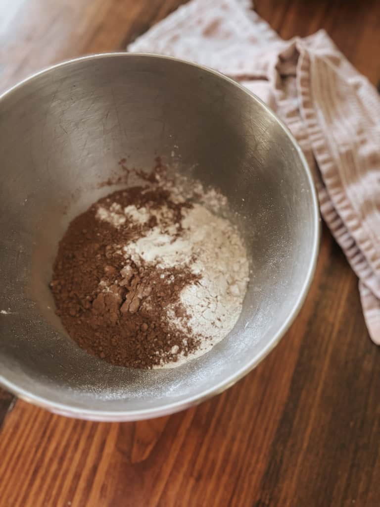 Mix the Dry Ingredients—In a large bowl, whisk together your dry ingredients: freshly milled flour, cocoa powder, salt, baking soda, and baking powder. This step ensures everything is evenly distributed and gives you the best rise.