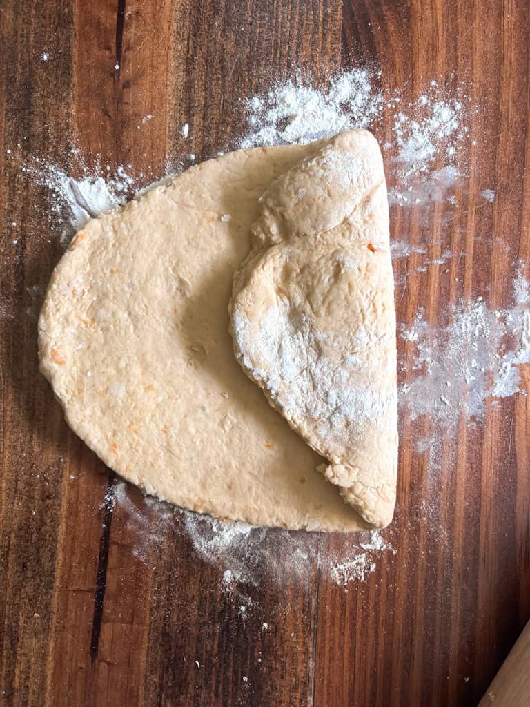 Roll and Fold the Dough—On a lightly floured surface and turn out the dough on to your clean work surface. Roll it out gently into a rectangle, then fold it in thirds like a letter. This step is crucial. Why? Because it stacks layers of butter and dough, helping those biscuits puff into flaky perfection. Repeat the fold once more, then roll out the sweet potato biscuit dough to about 1-inch thickness.