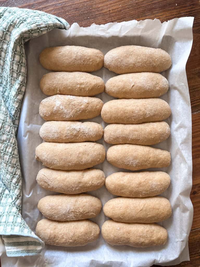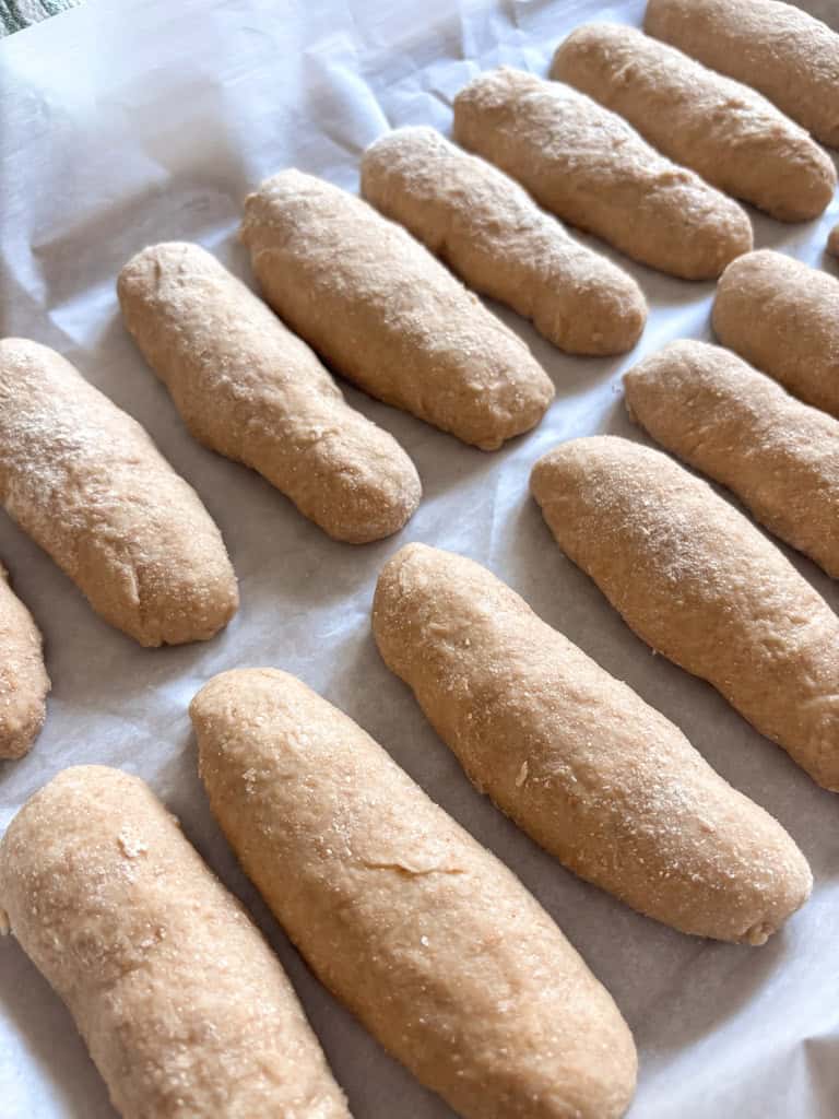 Let the dough balls rest on the counter for about 5-10 minutes. This short rest relaxes the gluten and makes shaping easier. To shape the buns, gently roll each ball into a log shape about the long side of a hot dogāI find 4-5 inches long works well. Place them seam side down on a parchment paper lined baking sheet. Be sure to place the seam side down so the buns hold their shape during baking.