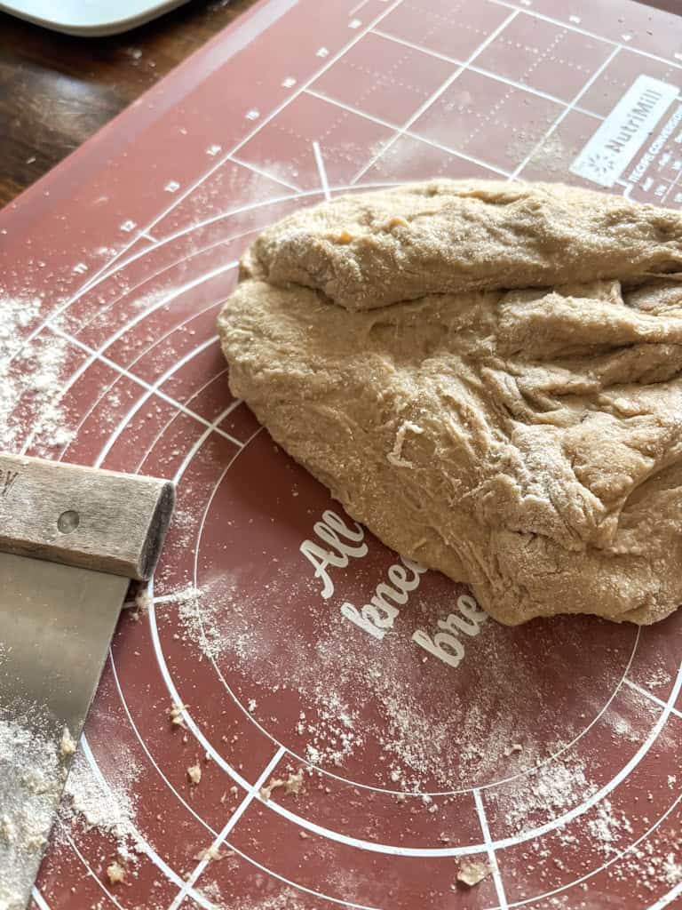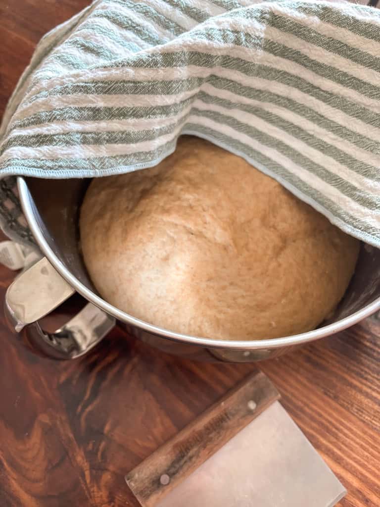 This is a sticky dough, and thatās completely normal when baking with whole wheat flour and fresh milled grains. Resist the urge to add extra flour unless absolutely necessary. The moisture helps create the final soft texture. Once kneaded, transfer the dough into a lightly greased bowl and cover it with plastic wrap or a towel. Let the dough rest in a warm place for the first rise until it doubles in sizeāabout an hour.