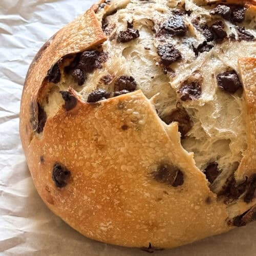 This overnight chocolate chip sourdough bread is naturally leavened and filled with pockets of melty chocolate. An easy artisan-style loaf that’s perfect for breakfast, dessert, or gifting.