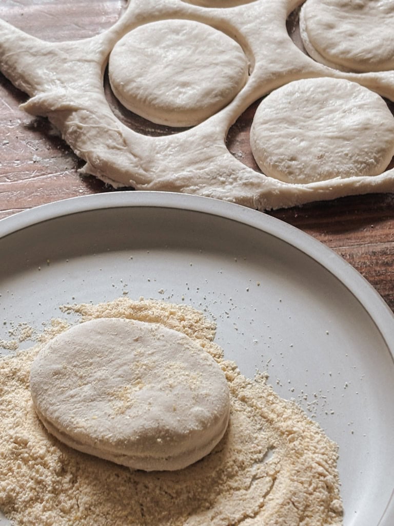 Dip each muffin in cornmeal on both sides, then place 4–5 muffins in the skillet, spaced about two inches apart.