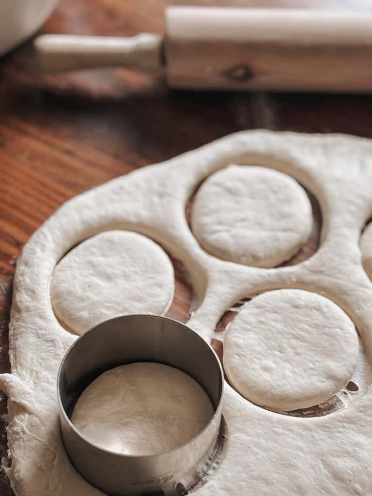 Use a biscuit cutter or even a cookie cutter (or the lid of a wide-mouth jar) to cut out circles. Aim for 10–12 equal pieces of dough.