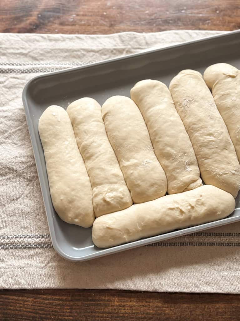 Each portion is shaped into a smooth log. These shaped buns don’t need to be perfect — just even. Place them seam-side down on a parchment paper lined baking sheet, leaving room to grow.
